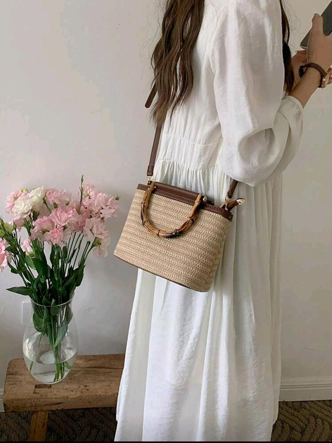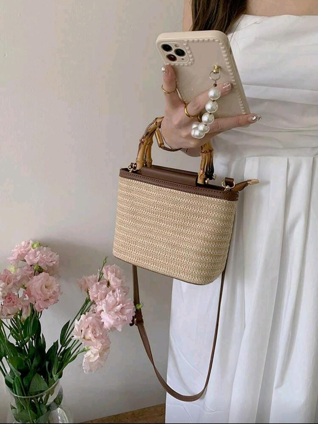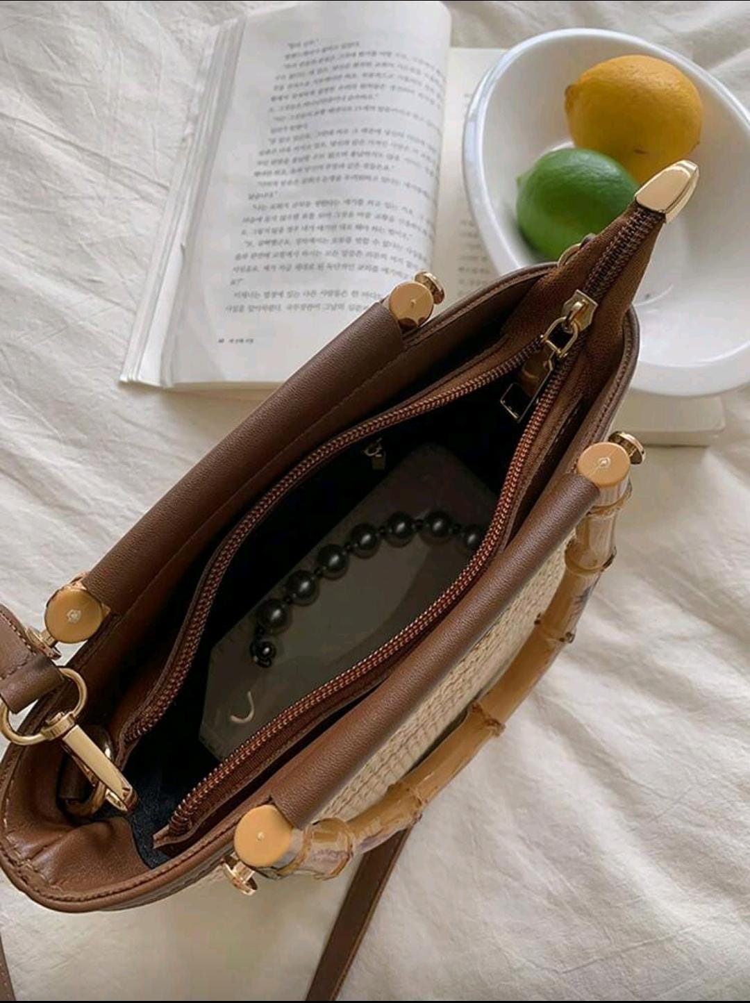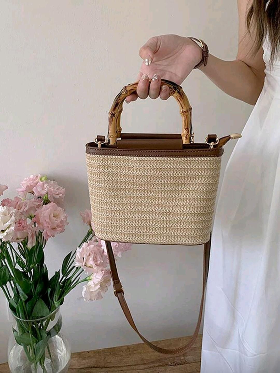 Handwoven Bamboo Knot Handbag | High-Quality Straw Weaving + PU Leather Patchwork | Japanese Style Artsy