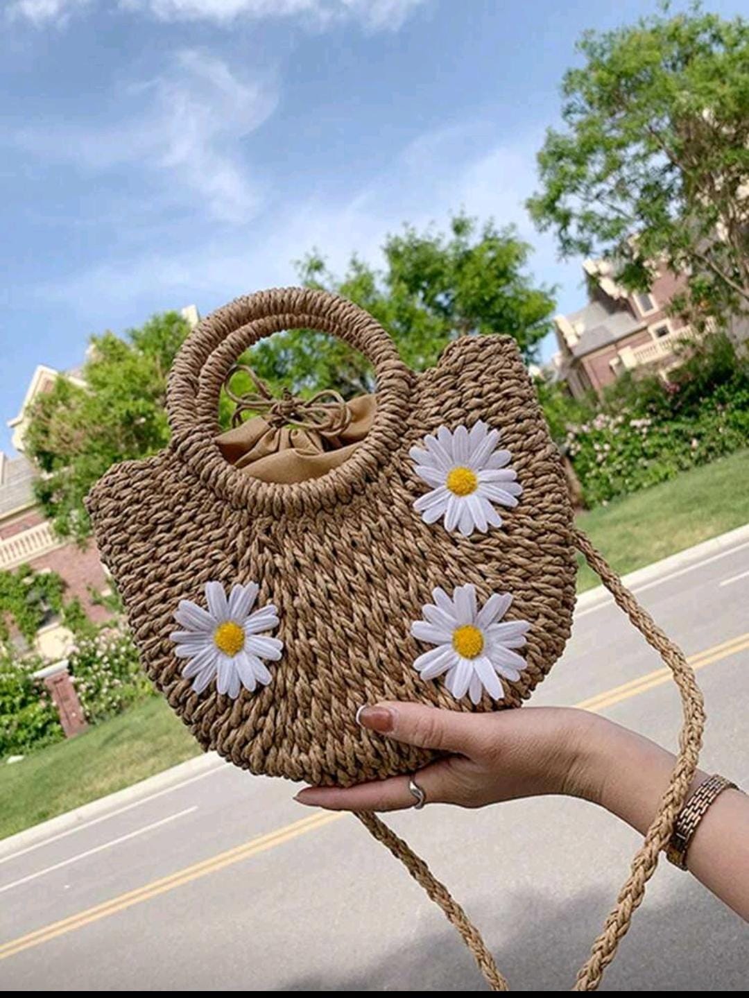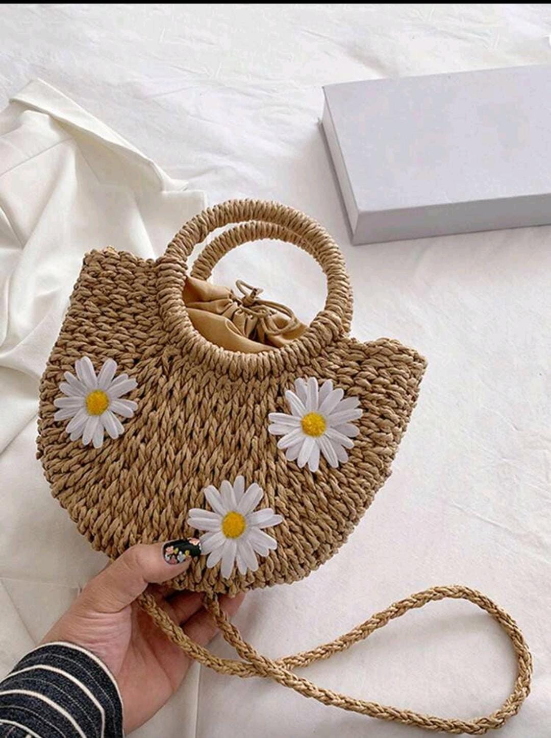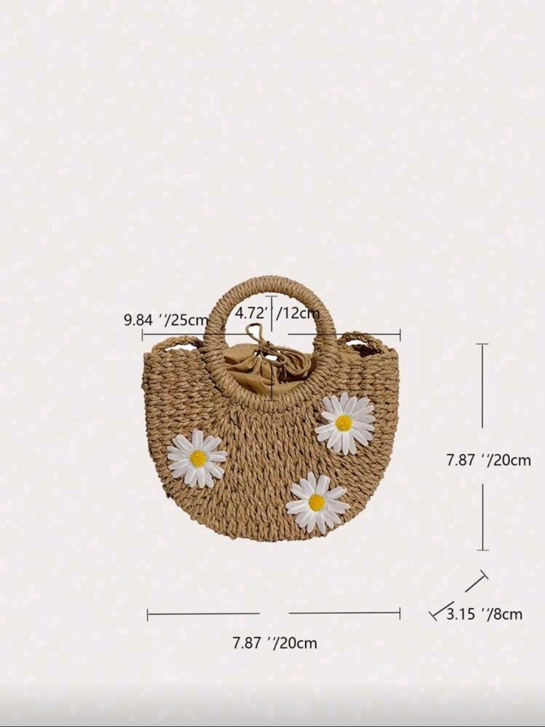 Round S Women Summer Bag Woven Semicircle Bohemia Crossbody Bags Daisy Decor Purse